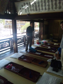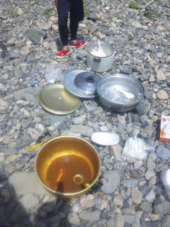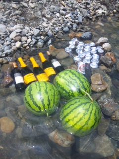 ビールやワイン、スイカなどを川の中に沈めておき、