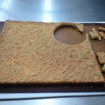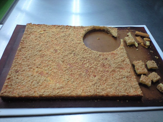 チーズスティックを試作しました。下の生地はヘーゼルプードルを入れて香ばしさにアクセントをだしたクッキー生地です。上のポロポロしたシュトロイゼルの食感とのバランスもいい感じでした。