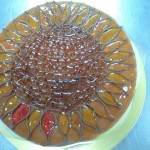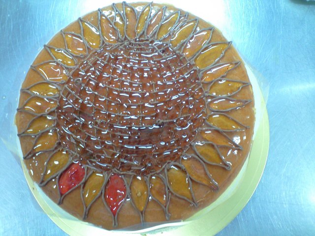 お客様のご希望で、チーズスフレにひまわりの絵を描いてみました。赤い花びらがアクセントなのですが変ですかね?