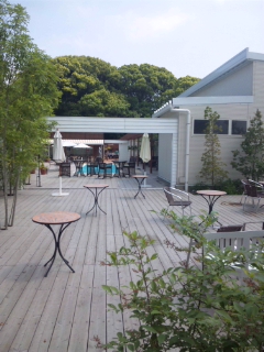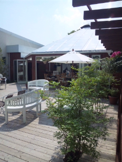 広い駐車場で、オレンジを基調にしたオシャレなお店。