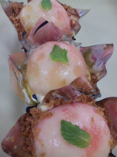 桃丸出しのケーキです。 桃の下にはロールケーキと たっぷりカスタードクリームがあり シンプルながら 最高の組み合わせになってます。