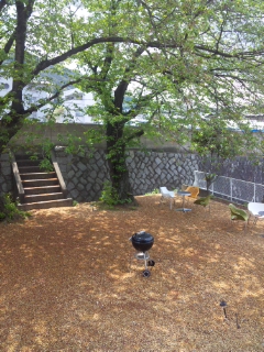 桜の木の下で唐揚げとかしわおにぎりを食べる。