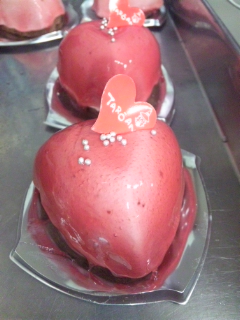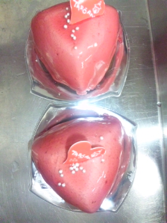 苺とフランボワーズのムース中に チーズクリーム。さらに秘密のソースを閉じ込めました(^O^) スポンジは ビスキュイショコラを合わせました。