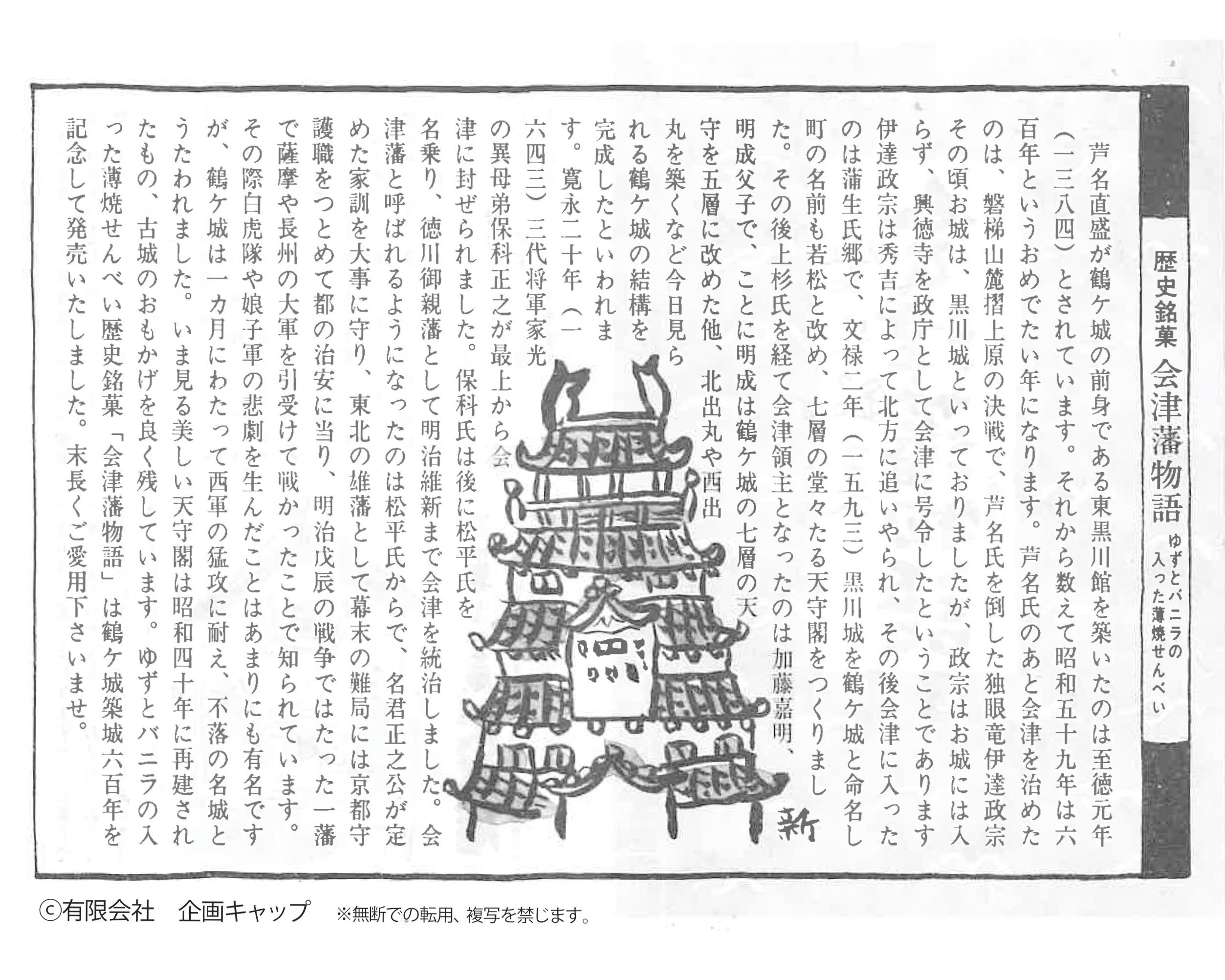 その際白虎隊や娘子軍の悲劇を生んだことはあまりにも有名ですが、鶴ケ城は一カ月にわたって西軍の猛攻に耐え、不落の名城とうたわれました。いま見る美しい天守閣は昭和四十年に再建されたもの、古城のおもかげを良く残しています。薄焼せんべい歴史銘菓「会津藩物語」は鶴ケ城築城六百年を記念して発売いたしました。末長くご愛用下さいませ。