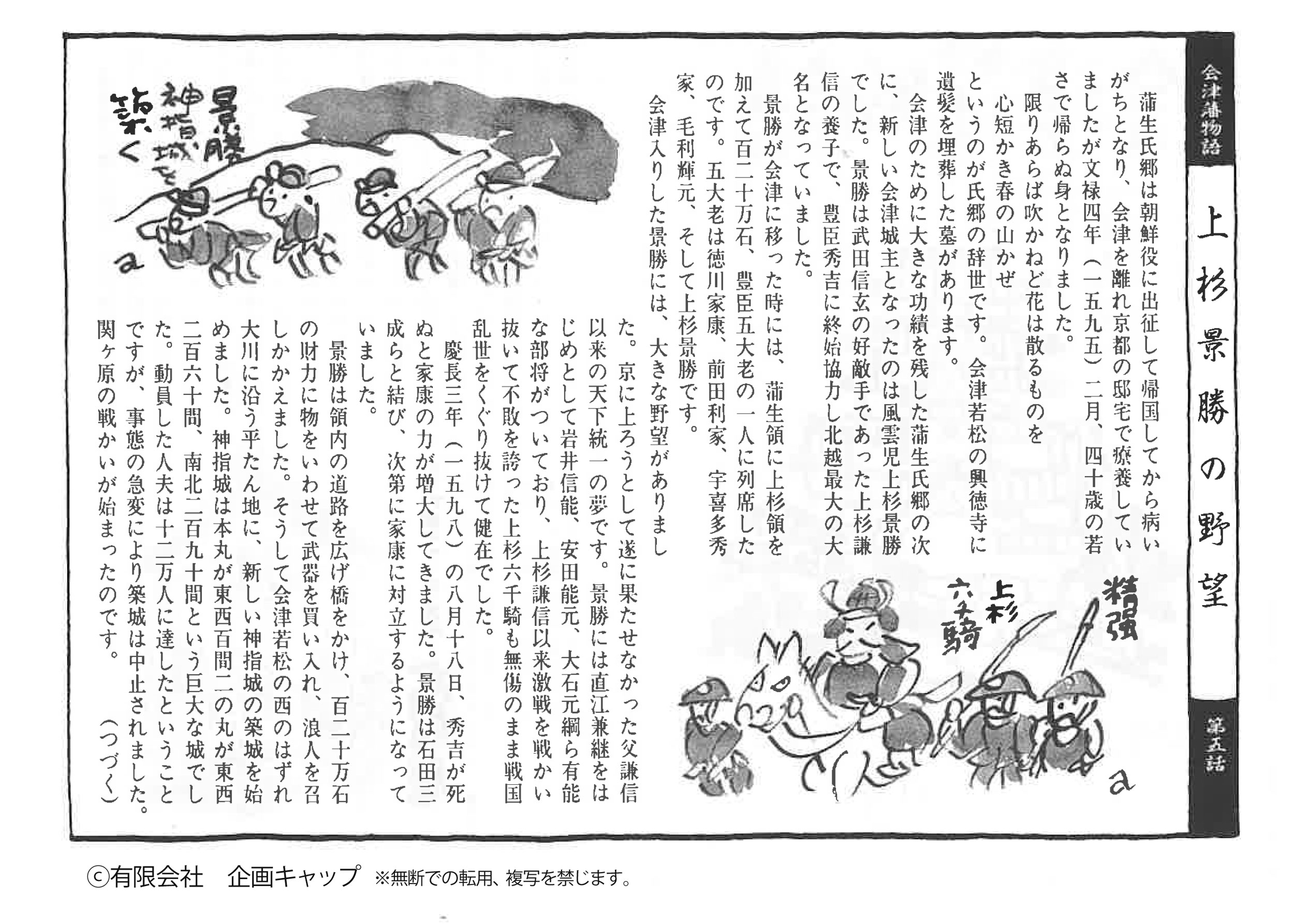 景勝は領内の道路を広げ橋をかけ、百二十万石の財力に物をいわせて武器を買い入れ、浪人を召しかかえました。そうして会津若松の西のはずれ大川に沿う平たん地に、新しい神指城の築城を始めました。神指城は本丸が東西百間二の丸が東西めました。神指城は本丸が東西百間二の丸が東西二百六十問、南北二百九十間という巨大な城でした。動員した人夫は十二万人に達したということですが、事態の急変により築城は中止されました。関ヶ原の戦かいが始まったのです。 (第六話へ つづく)