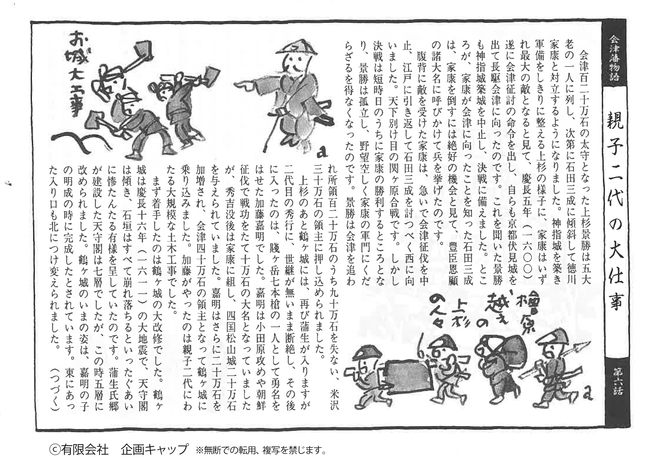 まず着手したのは鶴ヶ城の大改修でした。鶴ケ城は慶長十六年(一六一一)の大地震で、天守閣は傾き、石垣はすべて崩れ落ちるといったぐあいに惨たんたる有様を呈していたのです。蒲生氏郷が建設した天守閣は七層でしたが、この時五層に改められました。鶴ヶ城のいまの姿は、嘉明の子の明成の時に完成したとされています。東にあった入り口も北につけ変えられました。 (第七話へ つづく)