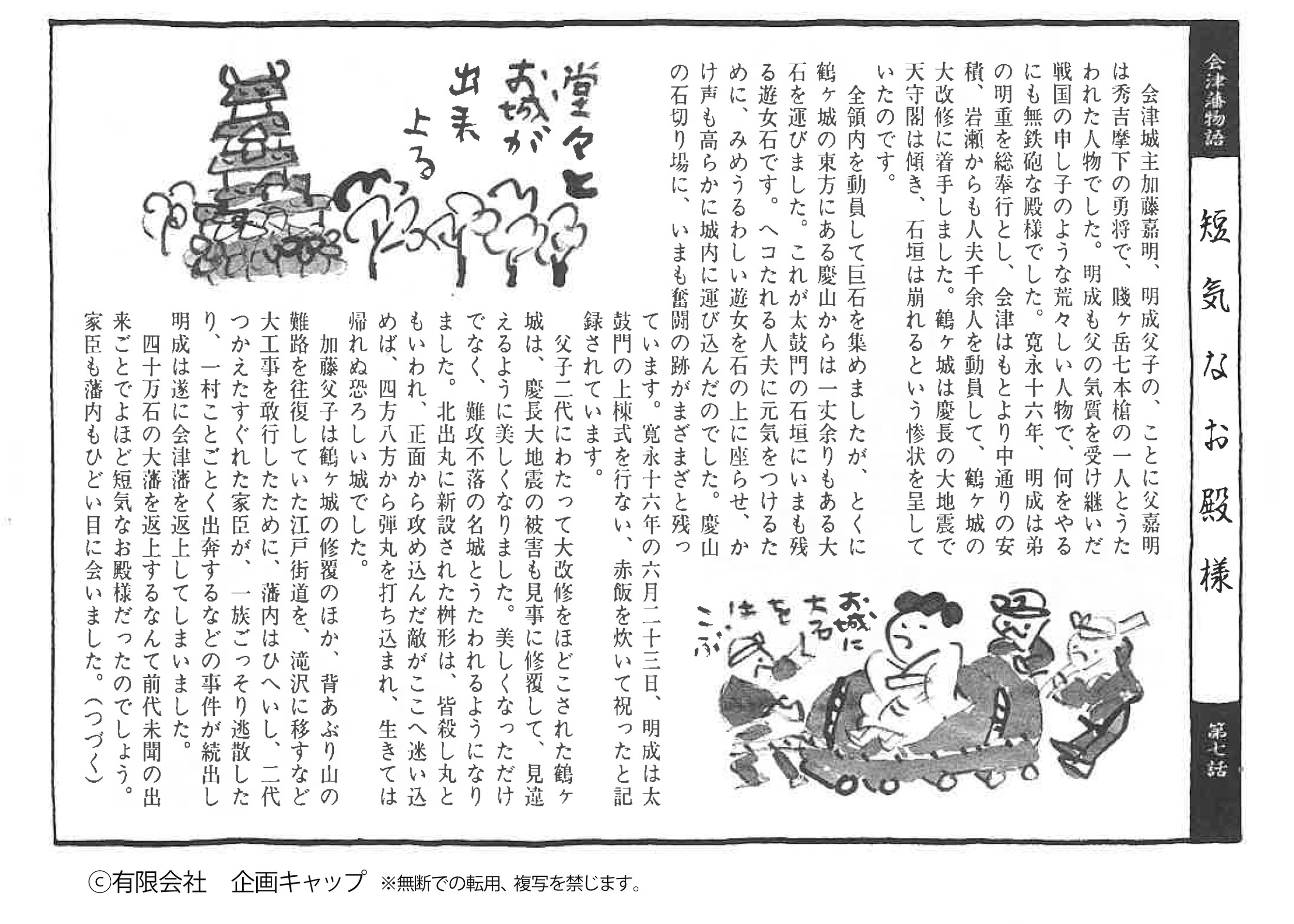 会津城主加藤嘉明、明成父子の、ことに父嘉明は秀吉摩下の勇将で、踐ヶ岳七本槍の一人とうたわれた人物でした。明成も父の気質を受け継いだ戦国の申し子のような荒々しい人物で、何をやるにも無鉄砲な殿様でした。宽永十六年、明成は弟の明重を総奉行とし、会津はもとより中通りの安積、岩瀬からも人夫千余人を動員して、鶴ヶ城の大改修に着手しました。鶴ヶ城は慶長の大地震で天守閣は傾き、石垣は崩れるという惨状を呈していたのです。