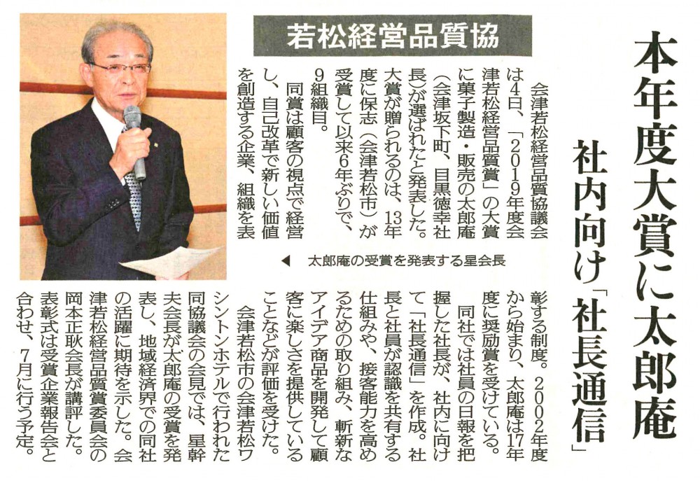 この度、2019年度の会津若松経営品質賞の大賞を受賞しました。 2017年度の奨励賞受賞から2年、社内の改善を進めより高い評価となる大賞を受賞することができました。 今回の受賞をこれからの発展のきっかけとし、お客様にさらなる満足をお届けできるよう、改善に努めて参ります。 今後も変わらぬご贔屓賜りますようお願い申しあげます。