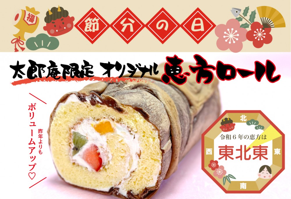 フルーツロールをココアシュー皮で巻いた恵方ロールで福を呼びましょう! 恵方を向いて無言で食すると縁起が良いとされています。 ご家族みんなでお楽しみください!