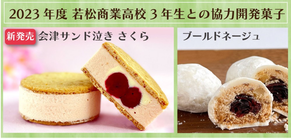 2023年に若松商業高校へ商品開発課題研究の講師として社長が行った際に、共同開発した商品。 【会津サンド泣き さくら】 桜のエキスを使用した香りの良いムースをクッキーでサンド。 おひとつ 480円税込(要冷蔵)