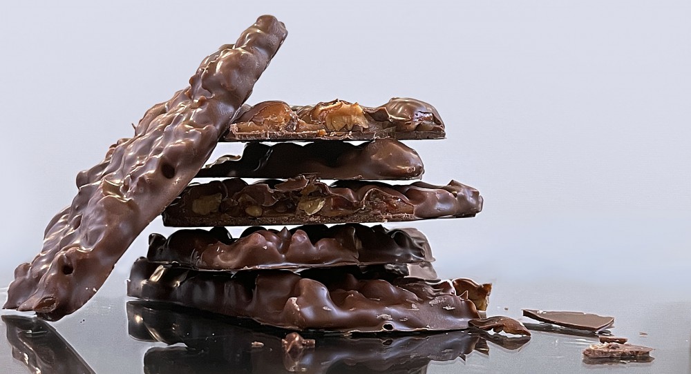 アーモンドとくるみを粗目にカットし、キャラメルのヌガーと合わせ、ミルクチョコでコーティング。少量の塩とオレンジがアクセント。