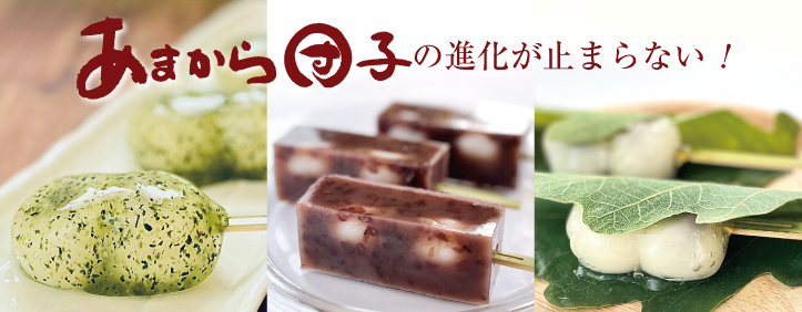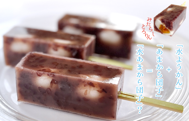 ぷるぷる団子のあまから団子。「あんこ」と「みたらし」が逆だったら?社員のひょんな発想から、生まれた【水あまから団子】とろ~りみたらしタレ入りのツルツル団子を粒あん水ようかんで包みました。