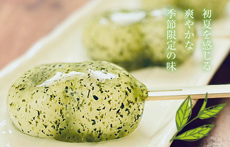 立春から数えて八十八日目にあたる日、5月2日㈫は、「八十八夜」。暦の上では、この日から夏になり、この日に摘んだお茶を一番茶として飲むと、一年を無病息災でいられると伝えられています。 こしあん入りのぷるぷる団子と、ふわっと開いた煎茶の茶葉も一緒に入れた「お茶タレ」が爽やかな初夏を感じさせてくれます。