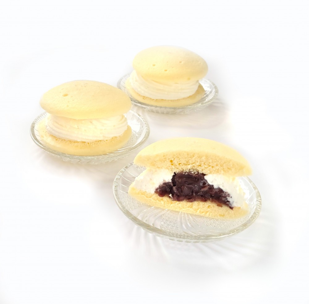 白い生どら 粒あんに沖縄県産塩「ぬちまーす」を使用。 ふんわり蒸した生地の上にも塩のアクセント。 おひとつ 260円税込