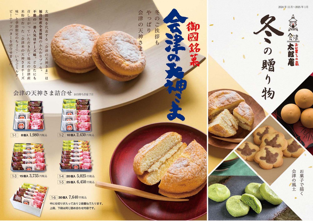 太郎庵 2025 福袋 店舗販売限定!初売りだけのお得な『お年玉券』が付いた福袋をご用意いたします! ※お年玉券使用期限2025年1月31日まで 4種詰合せ 3,000円税込 ・会津の天神さまチーズ5個入 ・会津の天神さまバターサブレ5枚入 ・会津とろ〜りショコラ抹茶の詩4個入 ・会津 黒豆美人2個入 2025年1月2日㊍3日㊎ 二日間限定販売 ※1月2日・3日全店営業時間 10:00〜16:00 ※店頭販売のみ ※太郎庵直営全店で販売いたします。