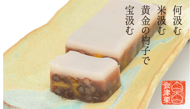 元日の早朝に新年初めて汲む水は邪気を除くと言われています。小豆と栗の羊羹の上に葛を流し、若水を表現しました。
