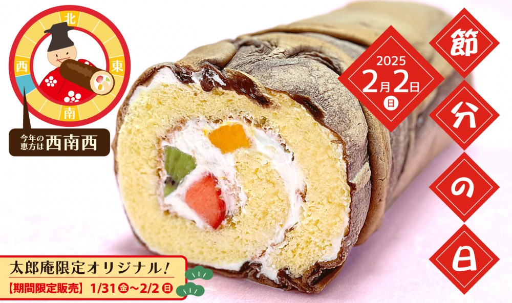 フルーツロールをココアシュー皮で巻いた恵方ロールで福を呼びましょう! 恵方を向いて無言で食すると縁起が良いとされています。 ご家族みんなでお楽しみください!