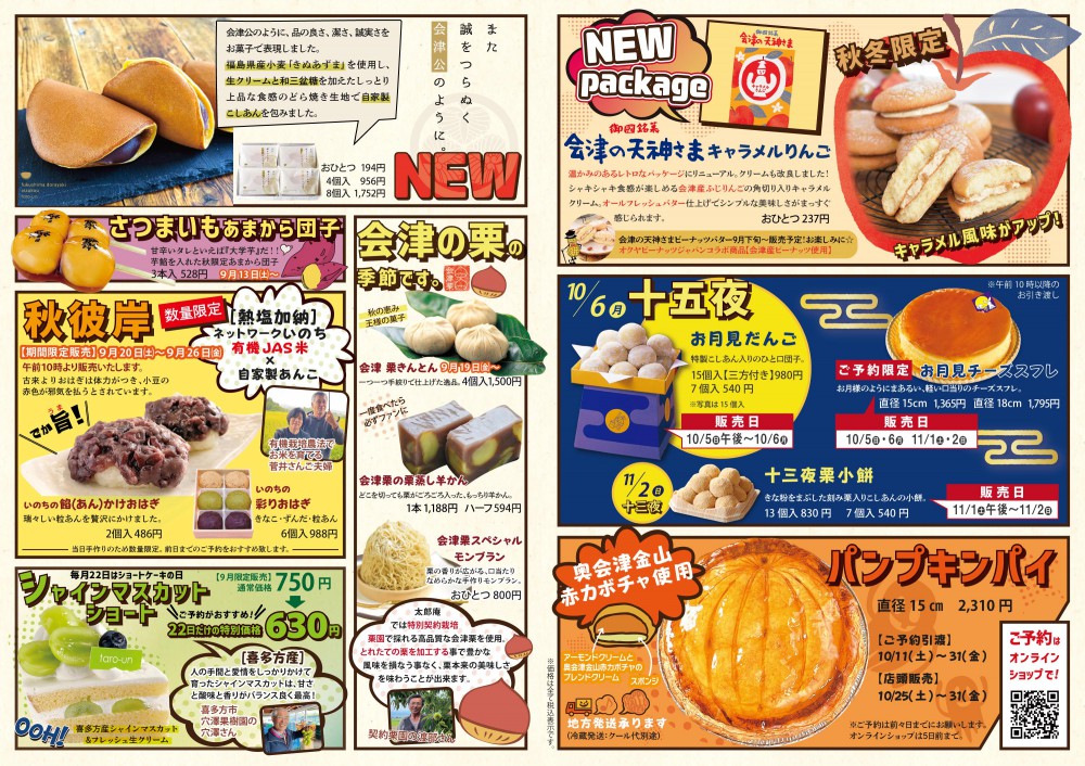 秋彼岸「いのちのおはぎ」 22日ショートケーキの日「シャインマスカットショート」が120円もお得! 十五夜「お月見だんご」ご予約承り中 ハロウィン「奥会津金山赤カボチャ使用 パンプキンパイ」