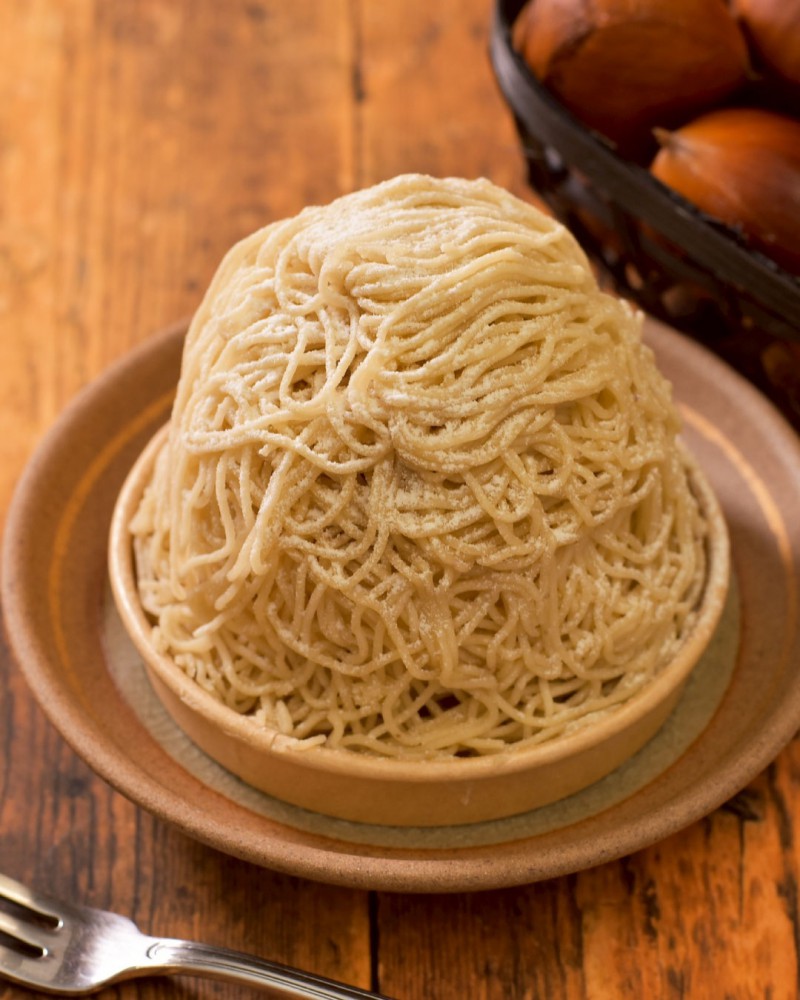 半熟スフレの上に会津栗モンブランペーストを絞りました。