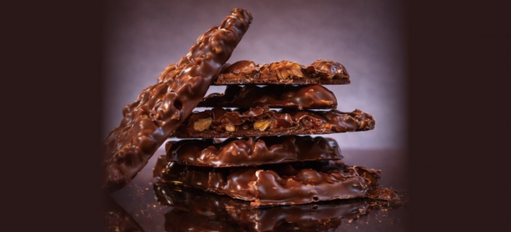 カリッと焼き上げたアーモンドとクルミのキャラメルヌガーをチョココーティング。